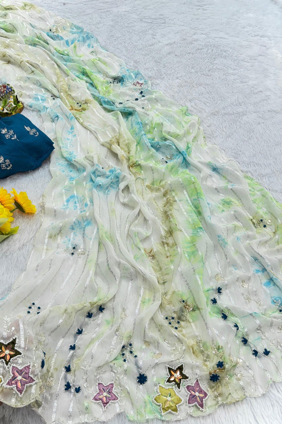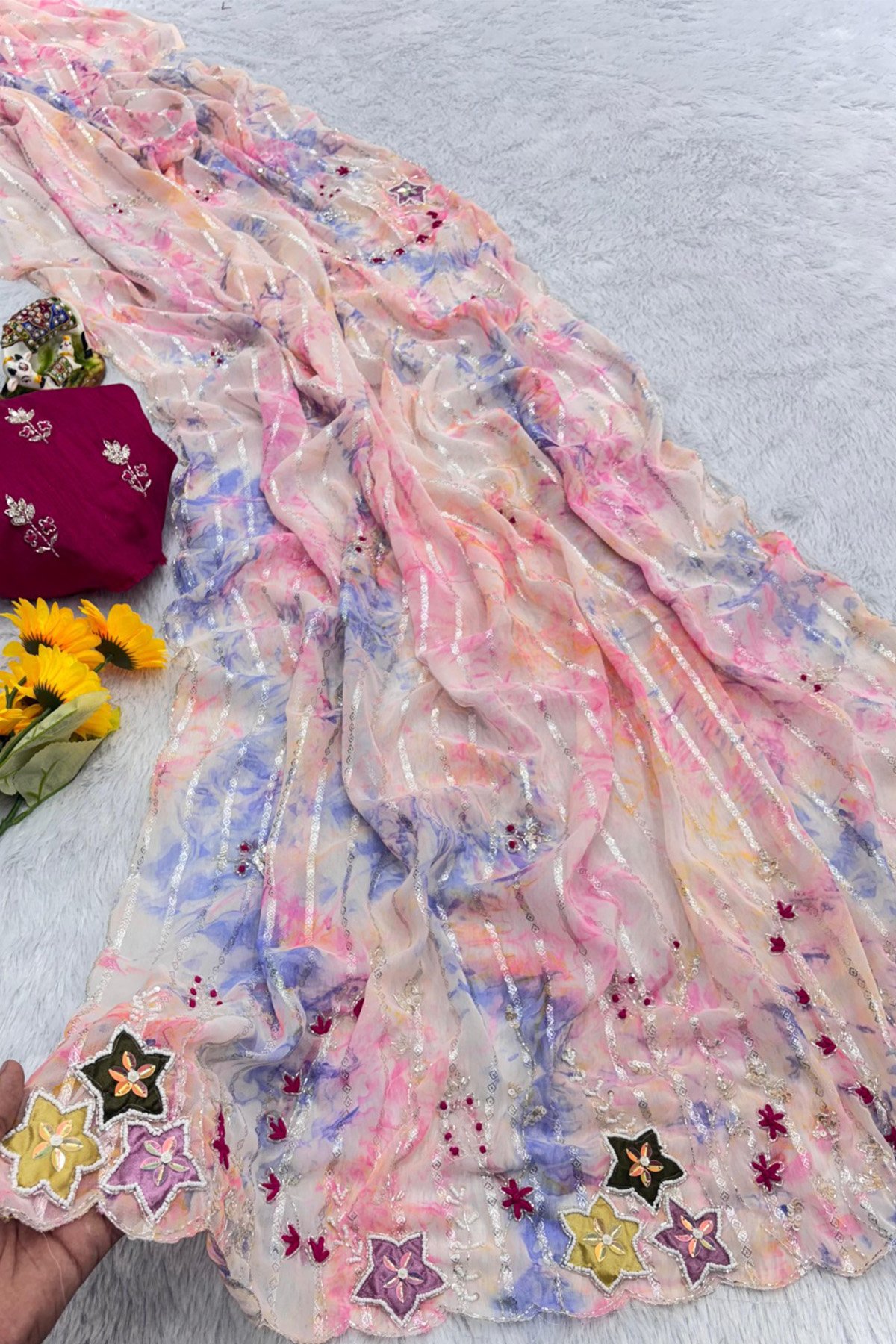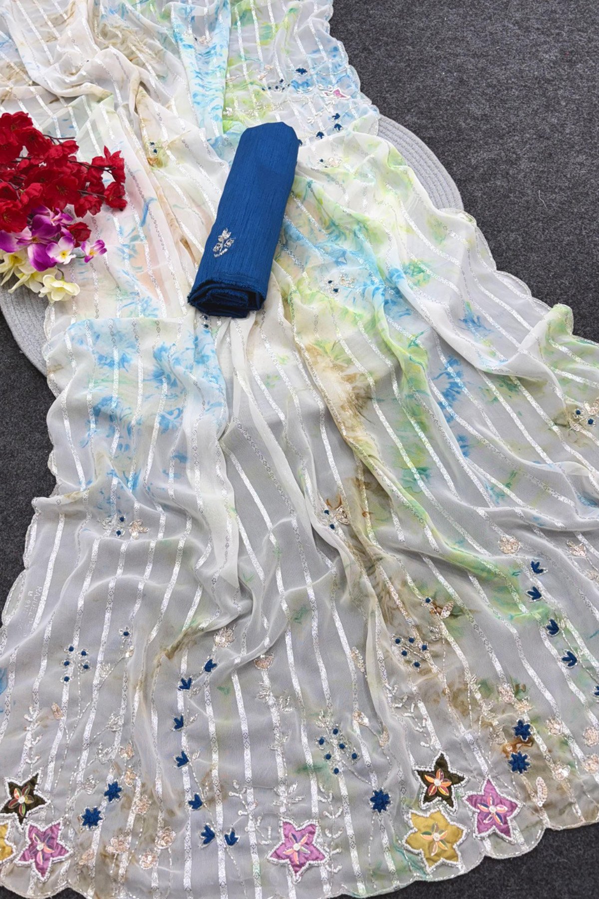 SAREE – Premium Soft Georgette Zari Line Fabric With Peachwork & Beats Handwork | BLOUSE – Premium Bland Ganji Silk With Peach Butti |