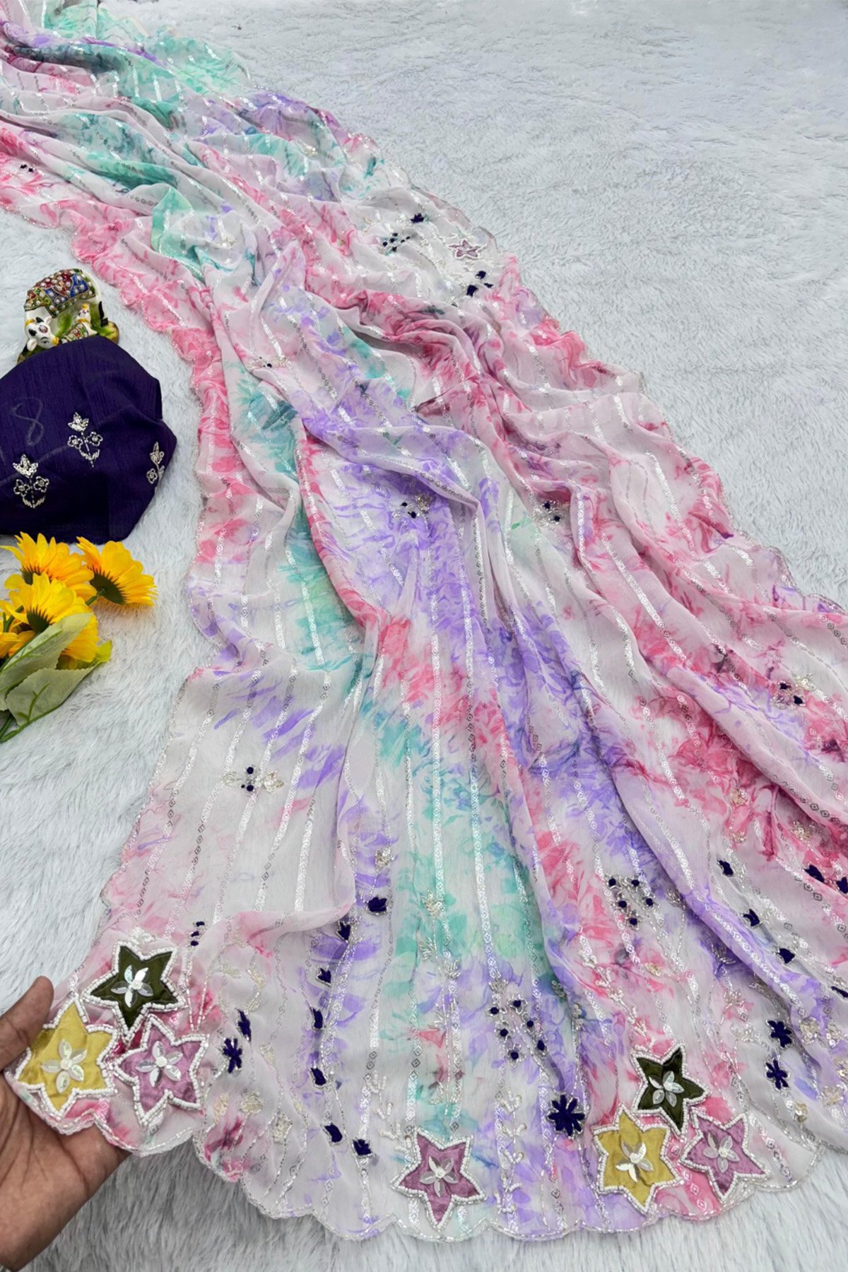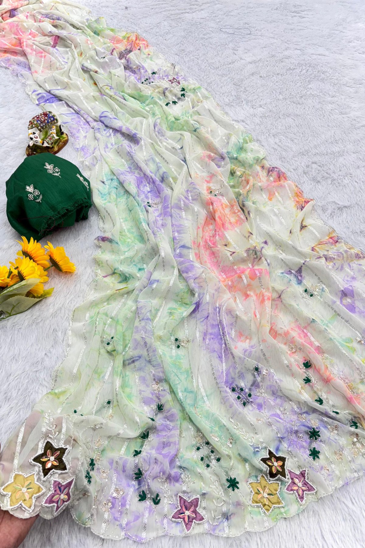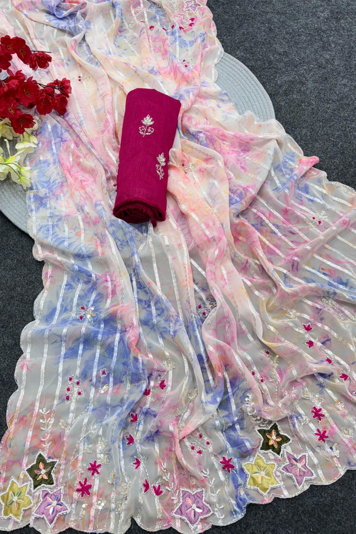 SAREE – Premium Soft Georgette Zari Line Fabric With Peachwork & Beats Handwork | BLOUSE – Premium Bland Ganji Silk With Peach Butti |