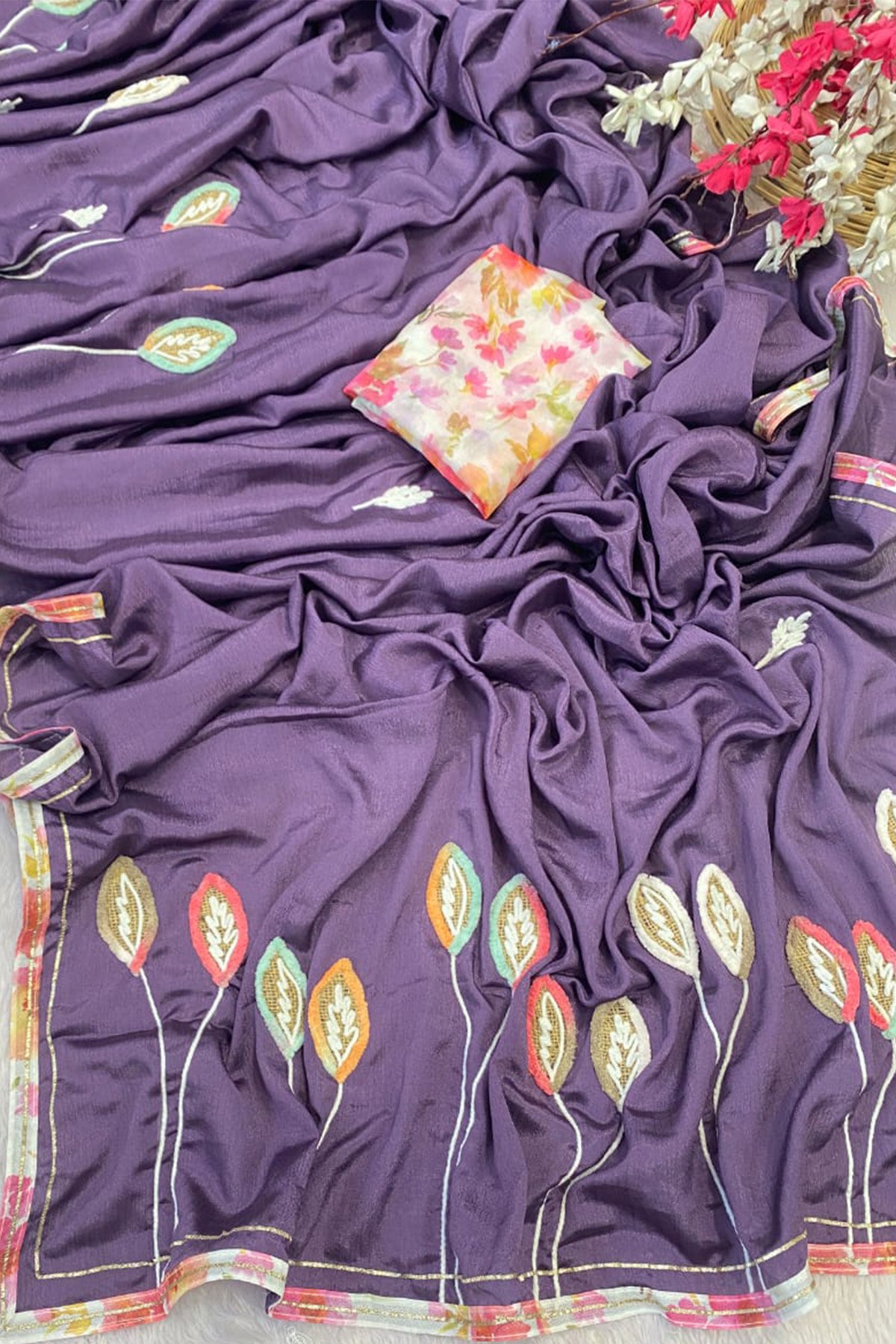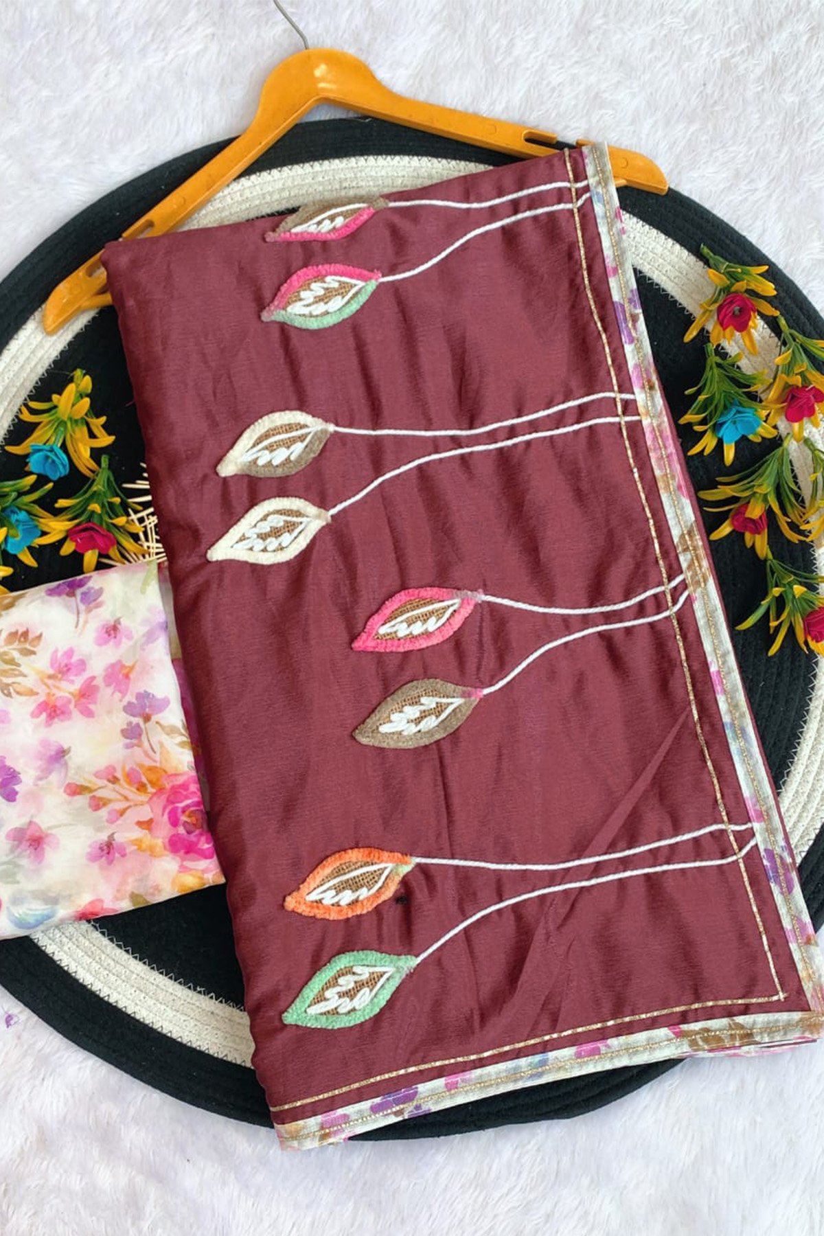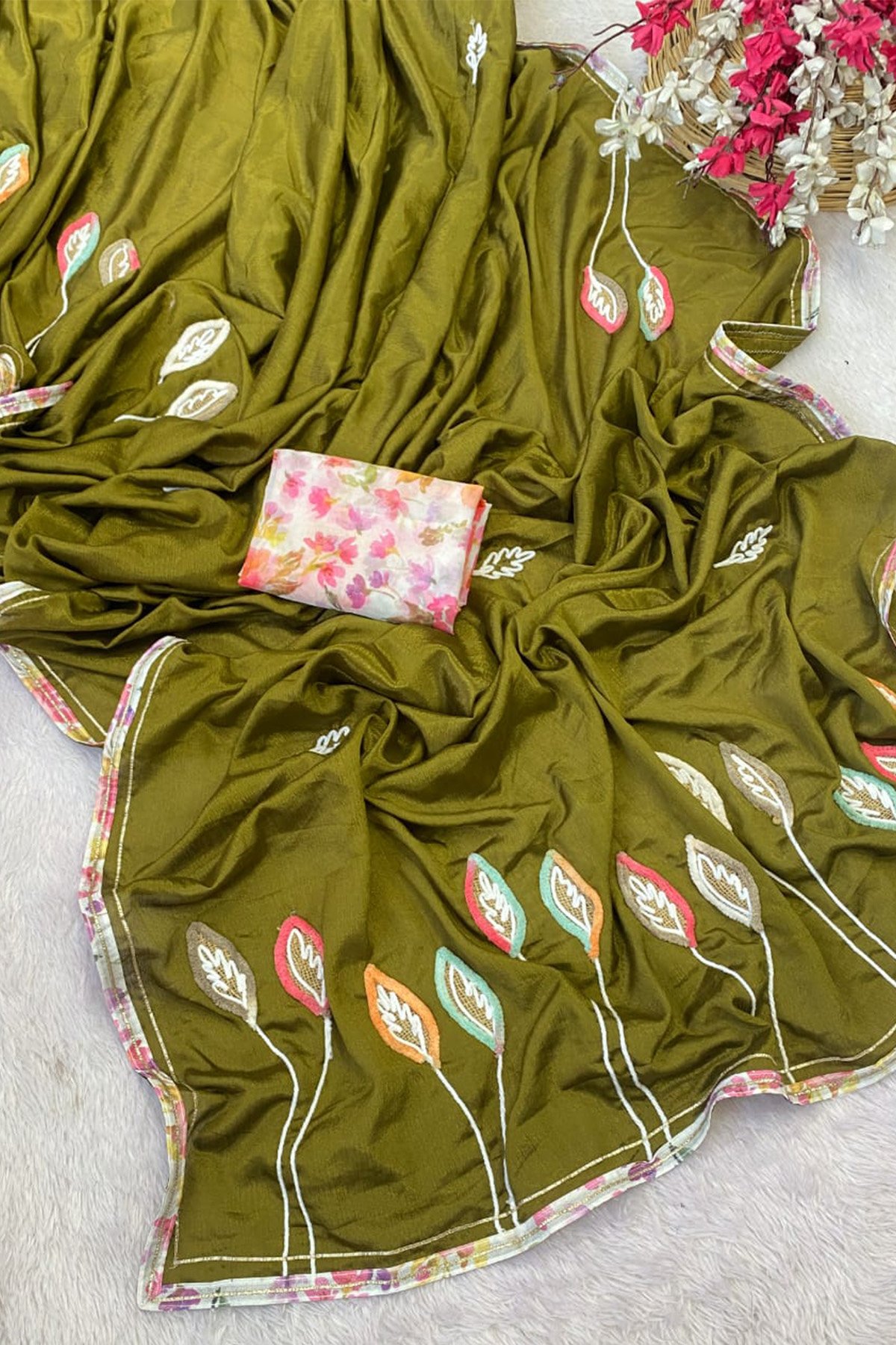 Saree – Beats And Moti Handwork And Jacquard Leaf Butti All Over Saree | BLOUSE – Tussels With Banarasi Blouse. |