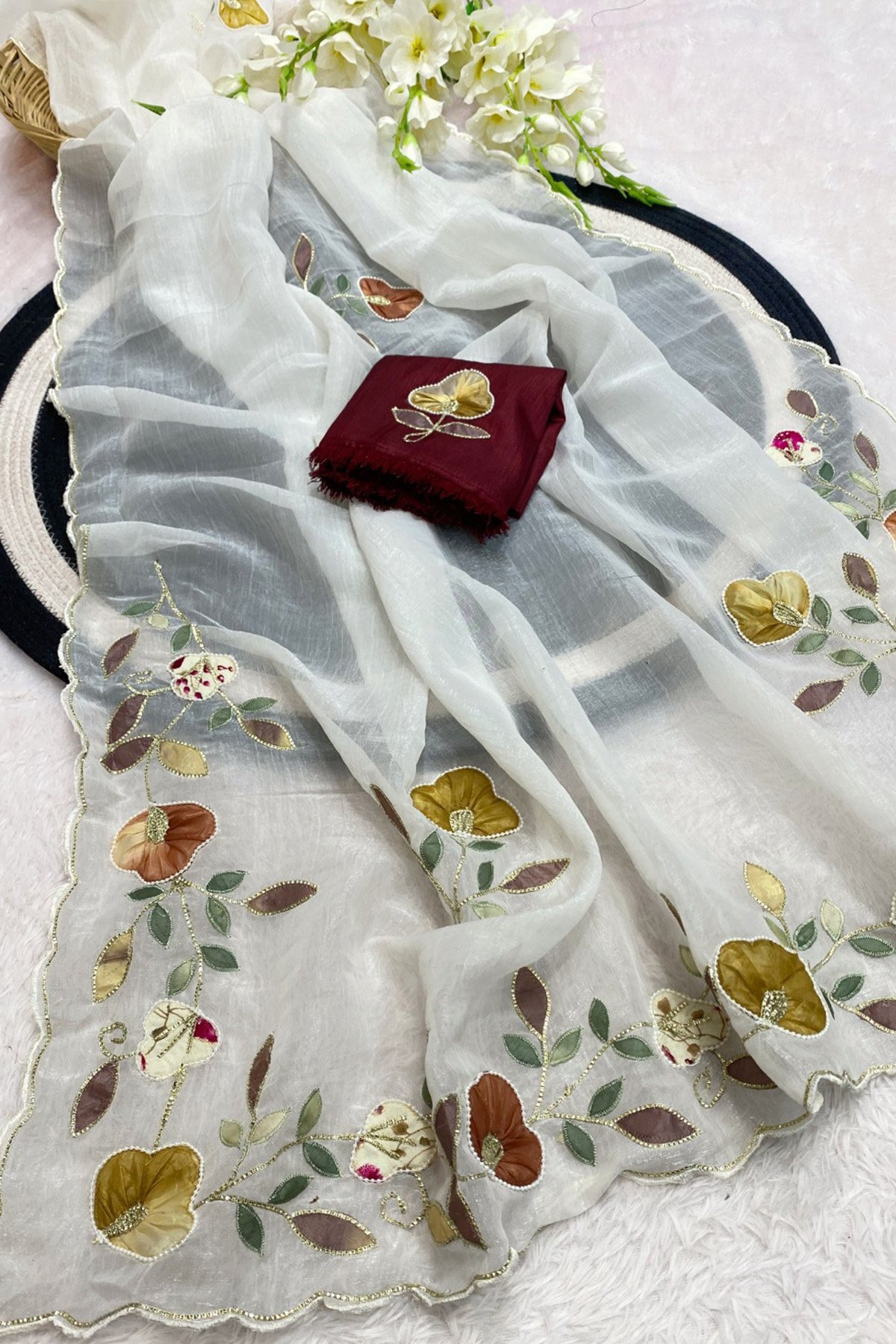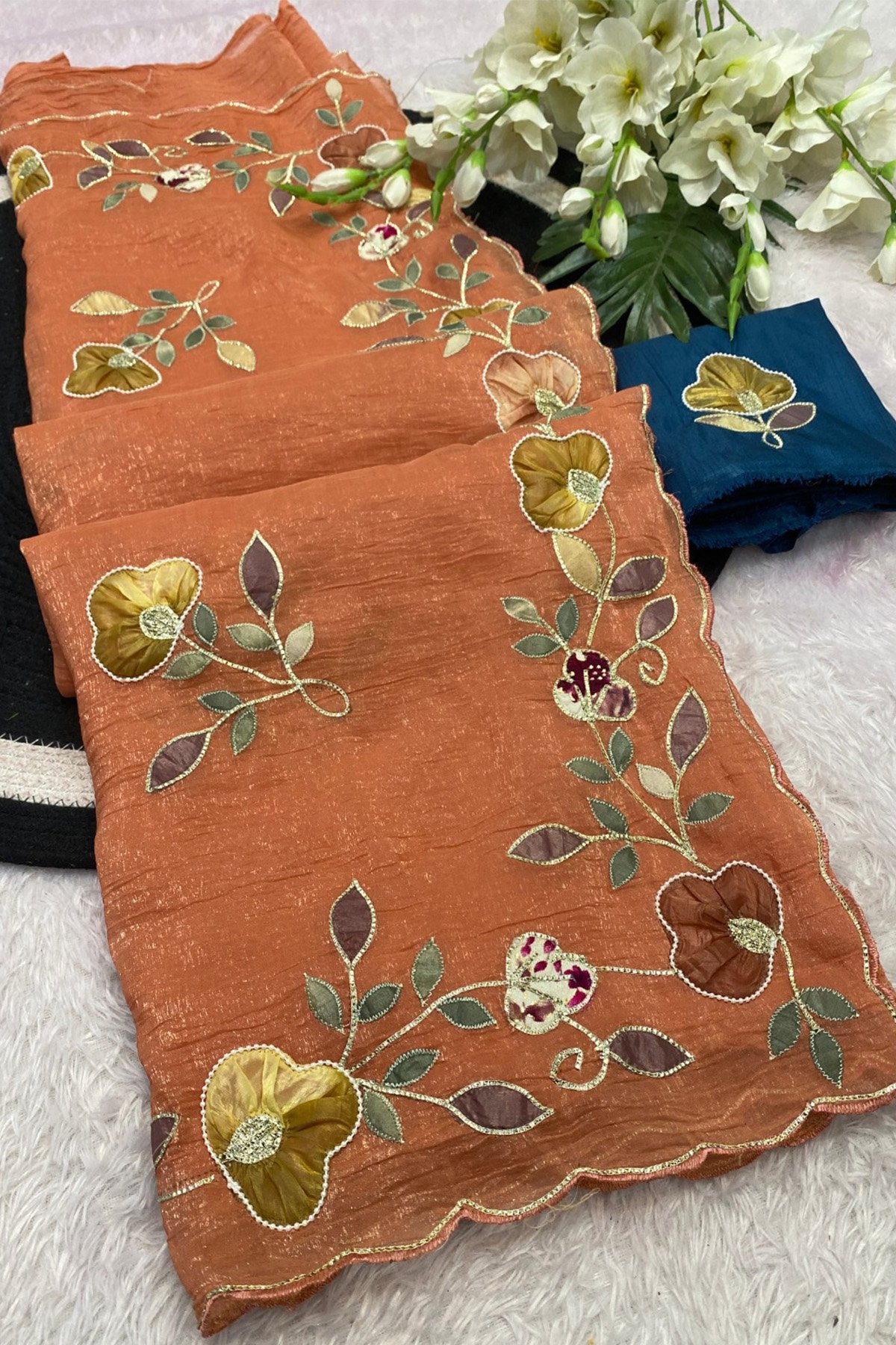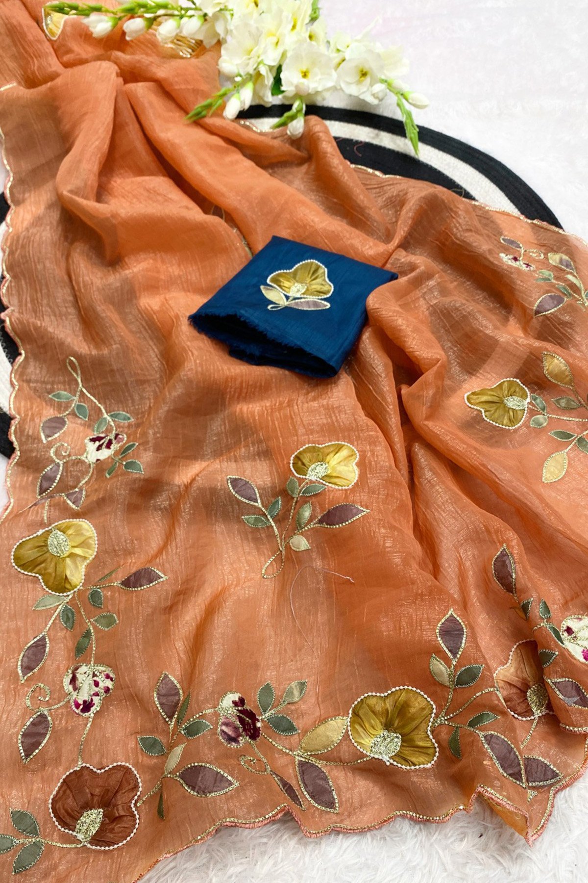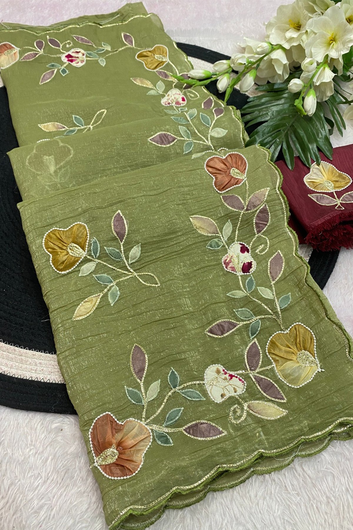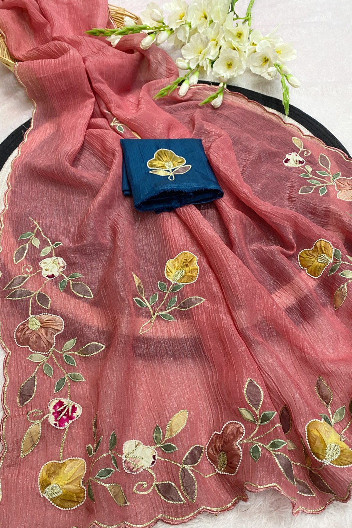 SAREE – Crunchy Chiffon Premium Quality Fabric C Pallu | Blouse :- Contrast Mono Bangalore With Patch & Handwork |