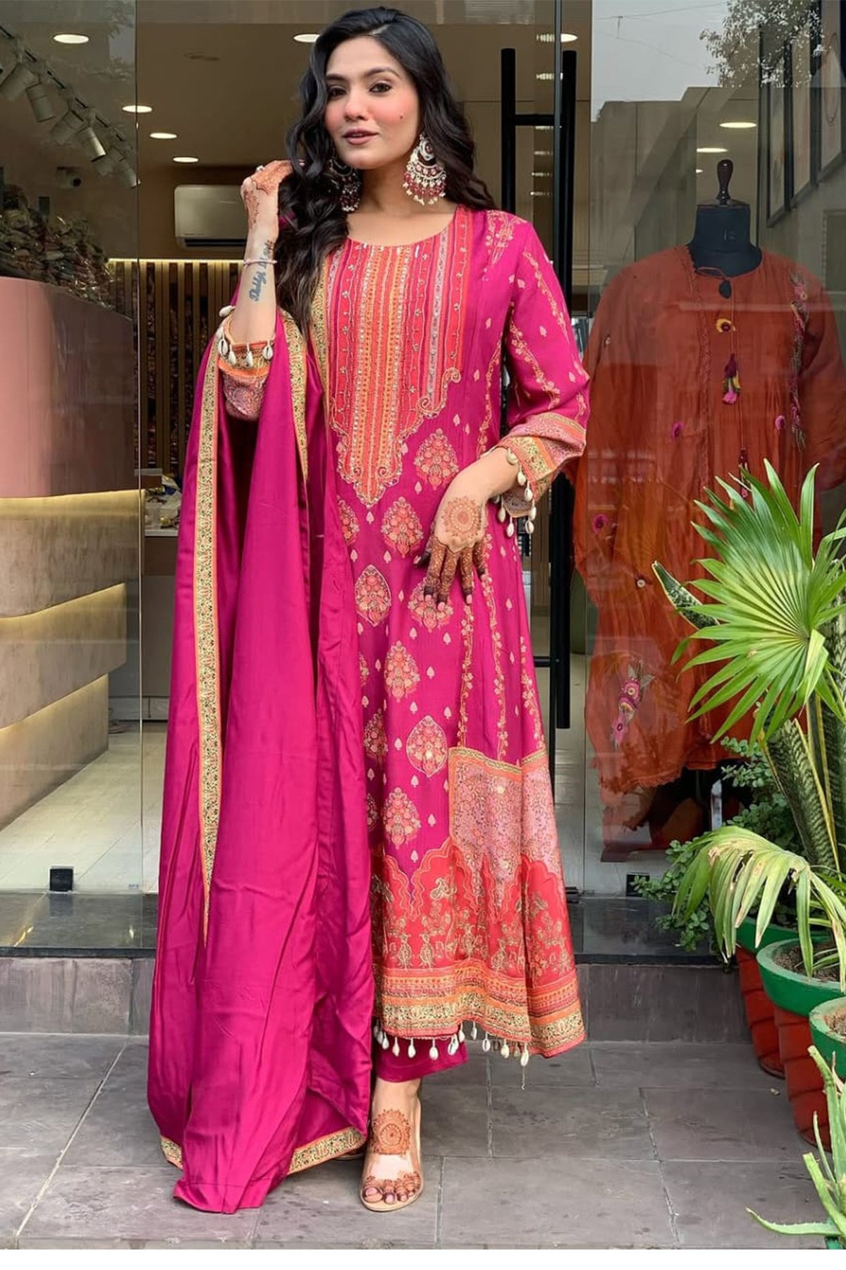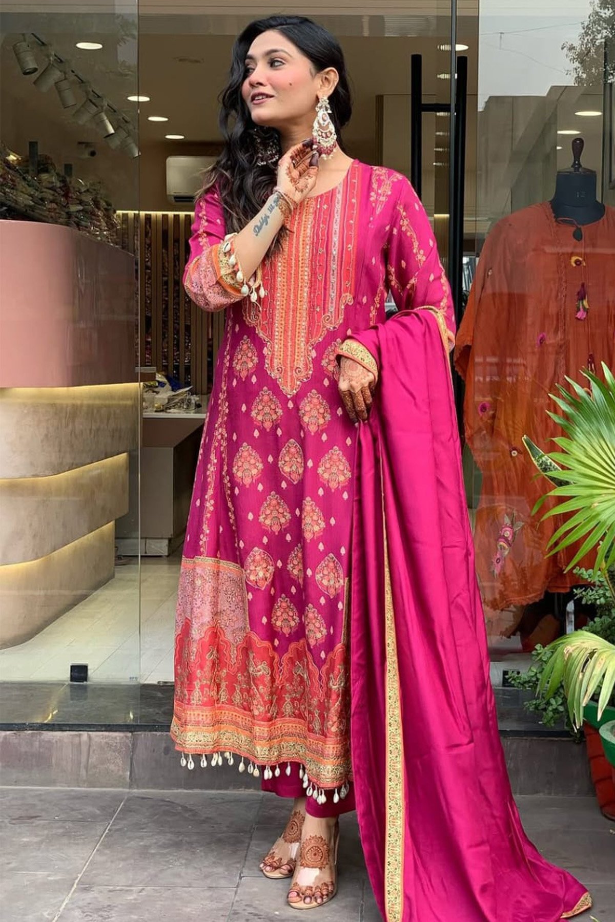 Pure Vatican Silk Fabric Straight Kurti With Pant Dupatta Set