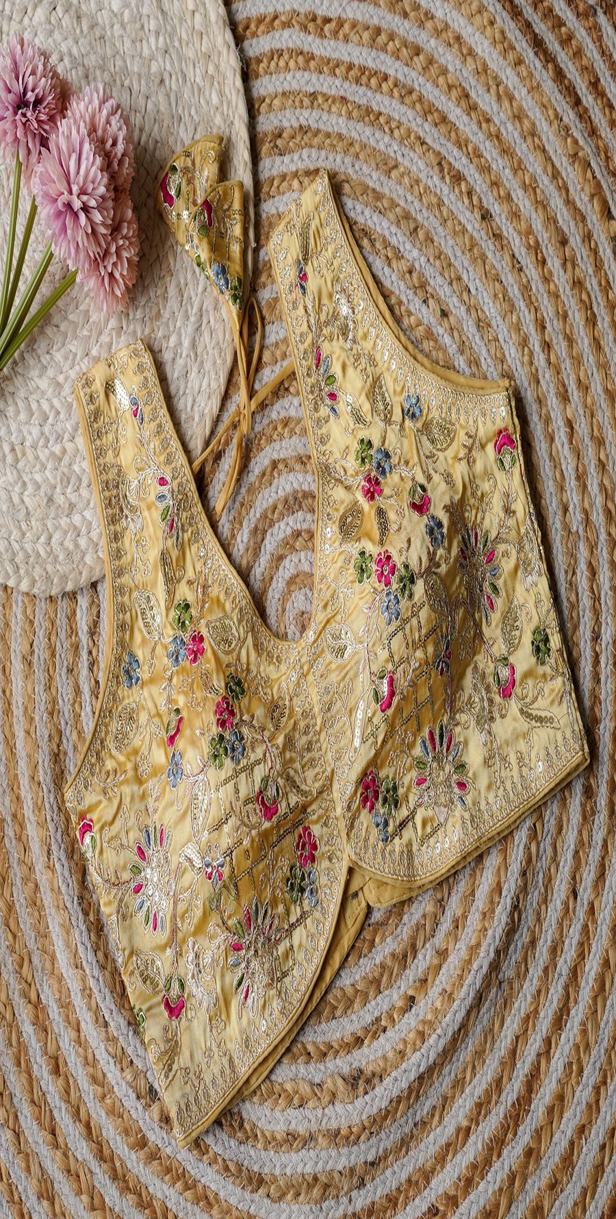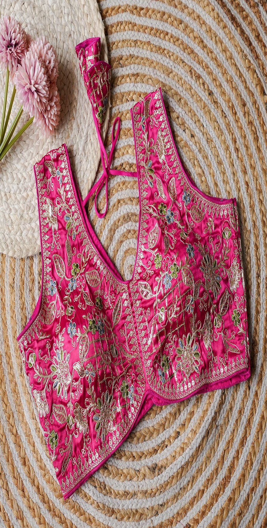 Fabric – Cosmos Silk | Work – Embroidery Cover With Sequence And Coding | Size:-36 To 38 | Sleeves -10 Inch | Pad: Yes Height :15 Inch |