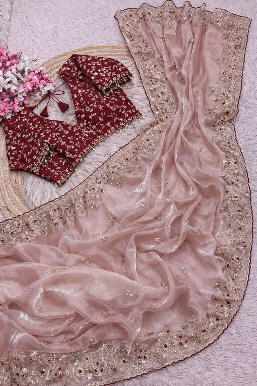 Saree Fabric :- Glass silk saree | Work :- Embroidery & Sequence Work | Blouse :- Unstitch Silk Blouse With Work |