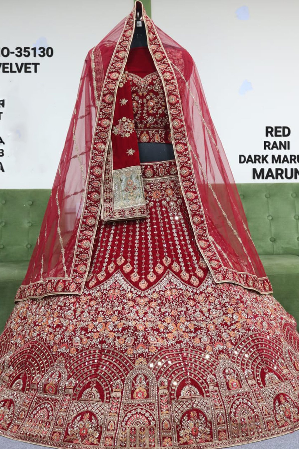 Lehenga – Velvet 12 Kali With Falir 5 Mtr Jarkan Dimond Work | Blouse – Velvet With Jarkan Dimond Work | DUPPATA -Net & Velvet Double Dupatta With Latkan