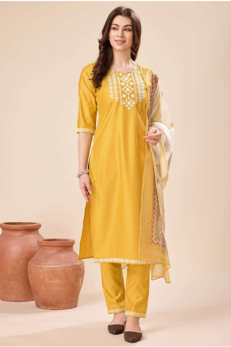 Gaji Silk Kashmiri Work Kurta Pant Dupatta Set
